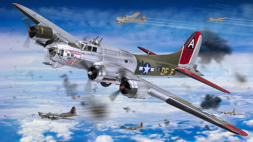 Perhaps more than any other aircraft of the Second World War, the four engined Boeing B-17 Flying Fortress embodied the awesome might of America’s military and industrial prowess and her determination to fight for total victory. Operating in massed formations over enemy occupied Europe, these distinctive aircraft were designed to conduct daylight precision bombing missions against strategic enemy targets, with the aim of literally pounding them into submission. As its name suggests, the Flying Fortress was bristling with defensive armament and it was intended that tight formations of B-17s would be able to throw so much lead into the air, that any attacking enemy aircraft would either be shot down before they could press home their attack, or see less committed pilots simply fly away from what would surely be their certain demise. Although things didn’t quite turn out this way during the savage aerial combat in the skies above Europe, it did help to earn the B-17 a fearsome reputation amongst Luftwaffe pilots.