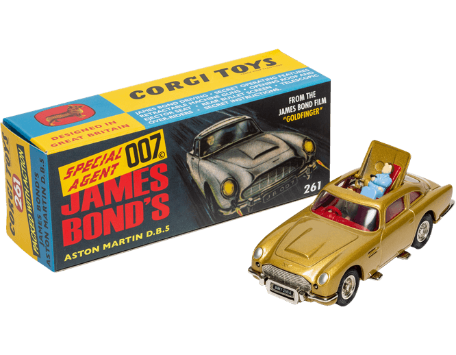 - CORGI produces the famous Aston Martin DB5 from the James Bond film 'Goldfinger'. The toy is packed with detail and features including pop out machine guns and a rear bulletproof shield, and a functioning ejector seat. It goes on to become the bestselling die-cast toy car of all time.